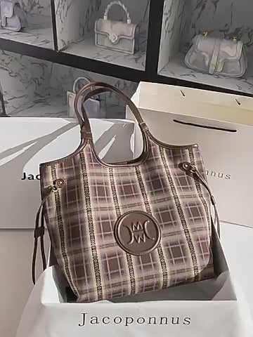 Bolso grande estilo tote con diseño a cuadros en tonos marrones y beige que aporta un aire distintivo y moderno. Diseño amplio y funcional con asas superiores firmes y laterales ajustables para mayor comodidad. Herrajes en tono dorado que completan su acabado elegante. Ideal para uso diario o de ocasión.